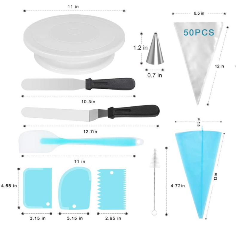Set components: cake turntable, decorating mouth, decorating bag, decorating scissors, cream pen, spatula, scraper