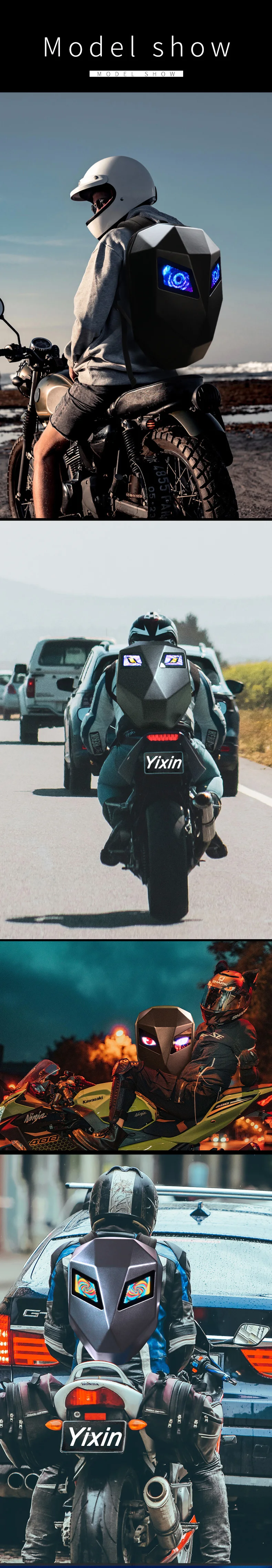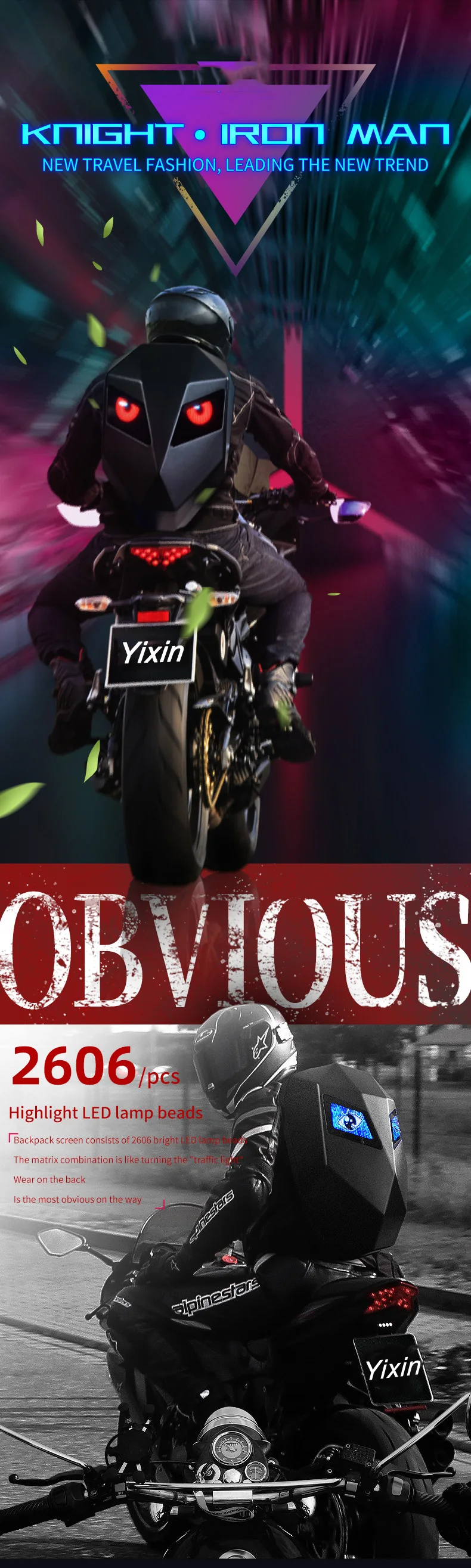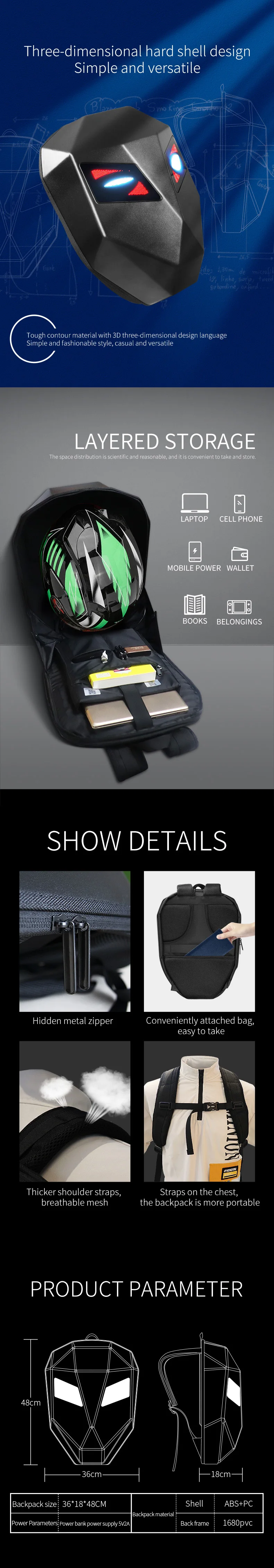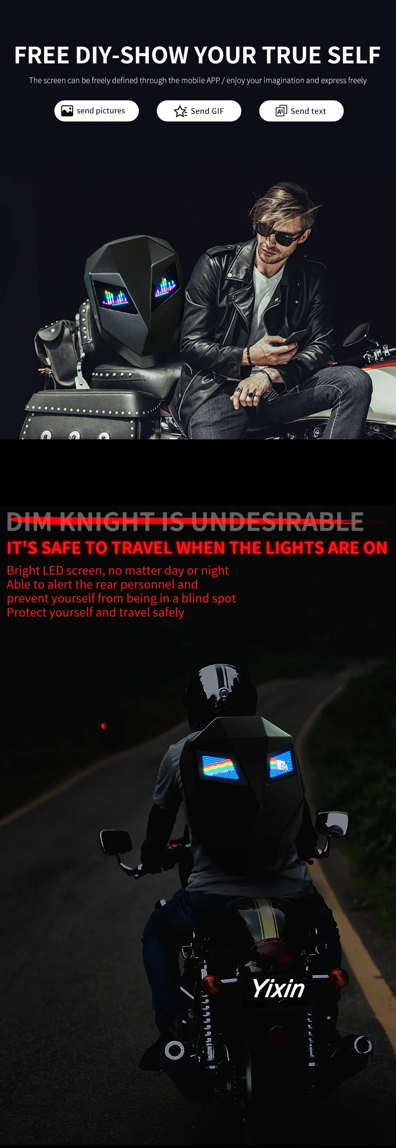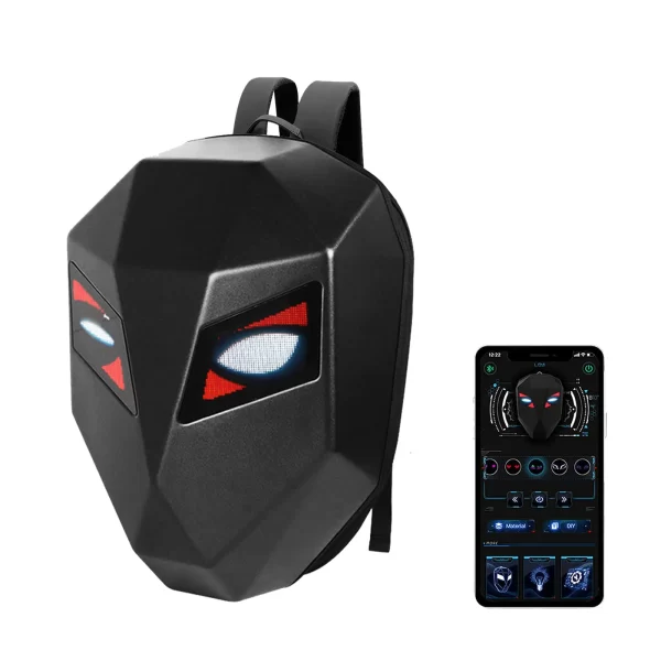 .【Material】LED smart knight backpack appearance purchase 3D hardcore waterproof material;the back width using 1680pvc ,48*48 full-color dot matrix screen , support text , pictures , GIF , and other formats ;adjustable shoulder strap size; breathable material for the back 【Cool Gift】The LED Knight Backpack with DIY screen is also the best gift for yourself or others on the Christmas, Birthday, Valentine’s Day…. 【How to use】Search on your mobile phone or directly scan the code to download the APP, plug in the mobile power supply through the built-in USB data port on the back, turn on the Bluetooth and scan the QR code to bind the backpack. You can connect the device and use it.