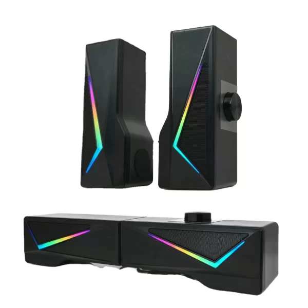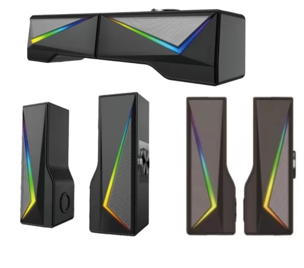 1.Compact and stylish appearance 2.Bluethooth or wired connetion ,hangable 3.RGB lights change with the rhythm of the music 4.Oustanding bass quality 5.Support: Bluetooth/LED light/Touch control 6.Accessories: audio cable,charging cable, manual